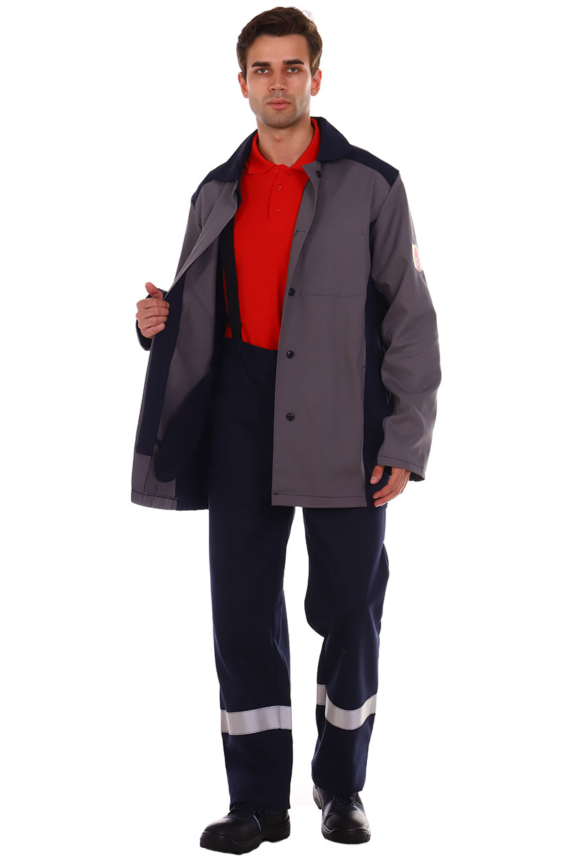 ➠ Куртка прямая с потайной застежкой на пуговицы. Полочки с рельефными швами, с боковыми вертикальными карманами. На левой полочке внутренний накладной карман. Спинка с вентиляционными отверстиями в швах притачивания кокетки. Рукава трехшовные. В верхней части боковых швов, под проймами обработаны вентиляционные отверстия. СОП 50 мм расположен по шву притачивания кокетки к спинке. СОП огнестойкий. Брюки с притачным поясом, застежка гульфика на пуговицы. На правой передней половинке – накладной карман с клапаном.